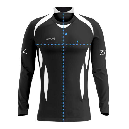Find a similar item of clothing that fits you well. Lie it down on a flat table. Measure your existing item from top to bottom (measurement A) and from underarm to underarm (measurement B). Compare these measurements with the detailed size chart below to find your size.